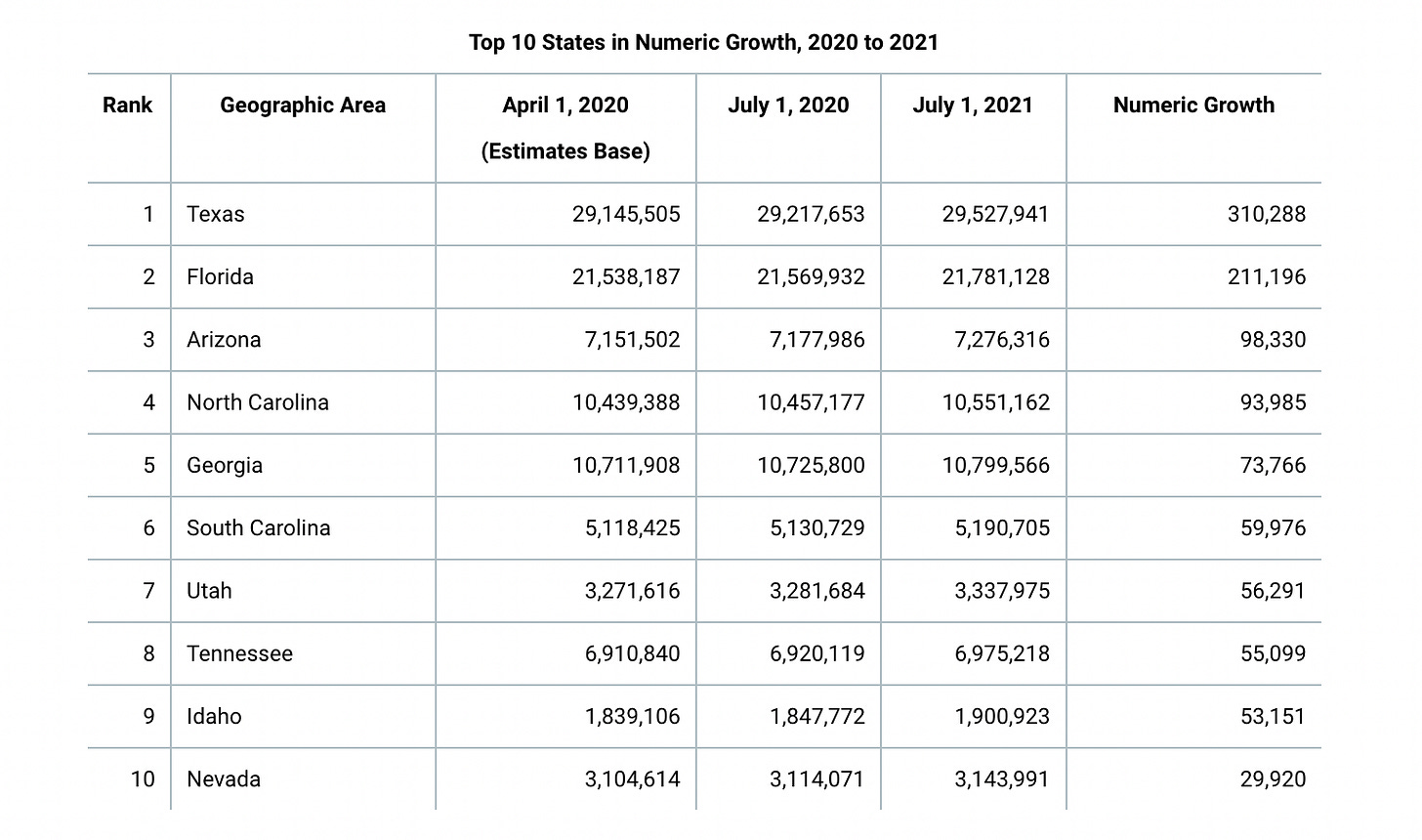 Texas, Florida, Arizona, North Carolina,…It shouldn’t surprise anyone that the fastest growing states are in the south, or particularly sunny. While some of this is likely due to polarization around COVID measures, a good chunk of it is simply the result of remote work, retirement, and pattern disruption. People have been migrating south since air conditioning made many of these states more habitable. The recent shocks simply gave people an opportunity to take the leap.